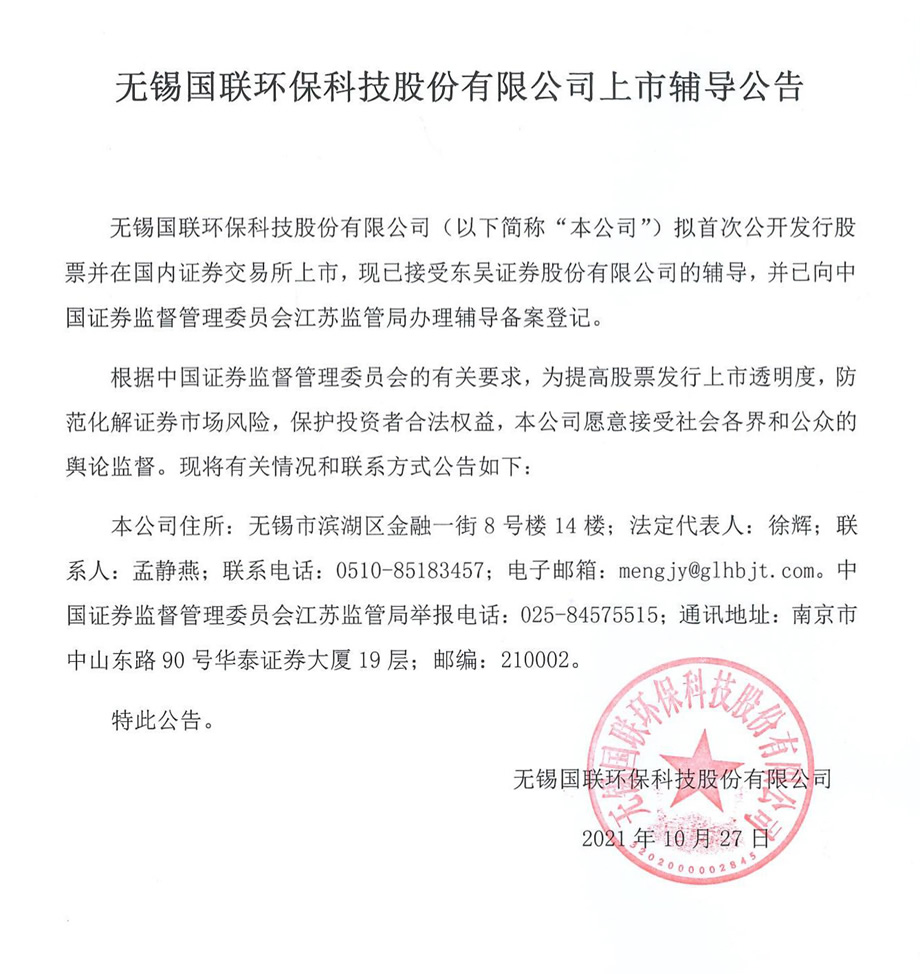 無錫國(guó)聯(lián)環(huán)保科技股份有限公司上市輔導(dǎo)公告